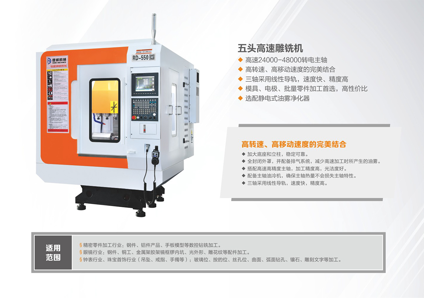 新型環(huán)保數(shù)控CNC -高速雕銑機采用高速24000-48000轉(zhuǎn)電主軸,選配靜電式油霧凈化器,三軸采用線性導軌,速度快,精度高,是模具、電極、批量零件加工;采用臺灣新代或臺灣寶元控制系統(tǒng),日本YASKWA電機及驅(qū)動,臺灣上銀、銀泰導軌及滾珠絲桿,華雕精密主軸,是高轉(zhuǎn)速、高移動速度的結合。